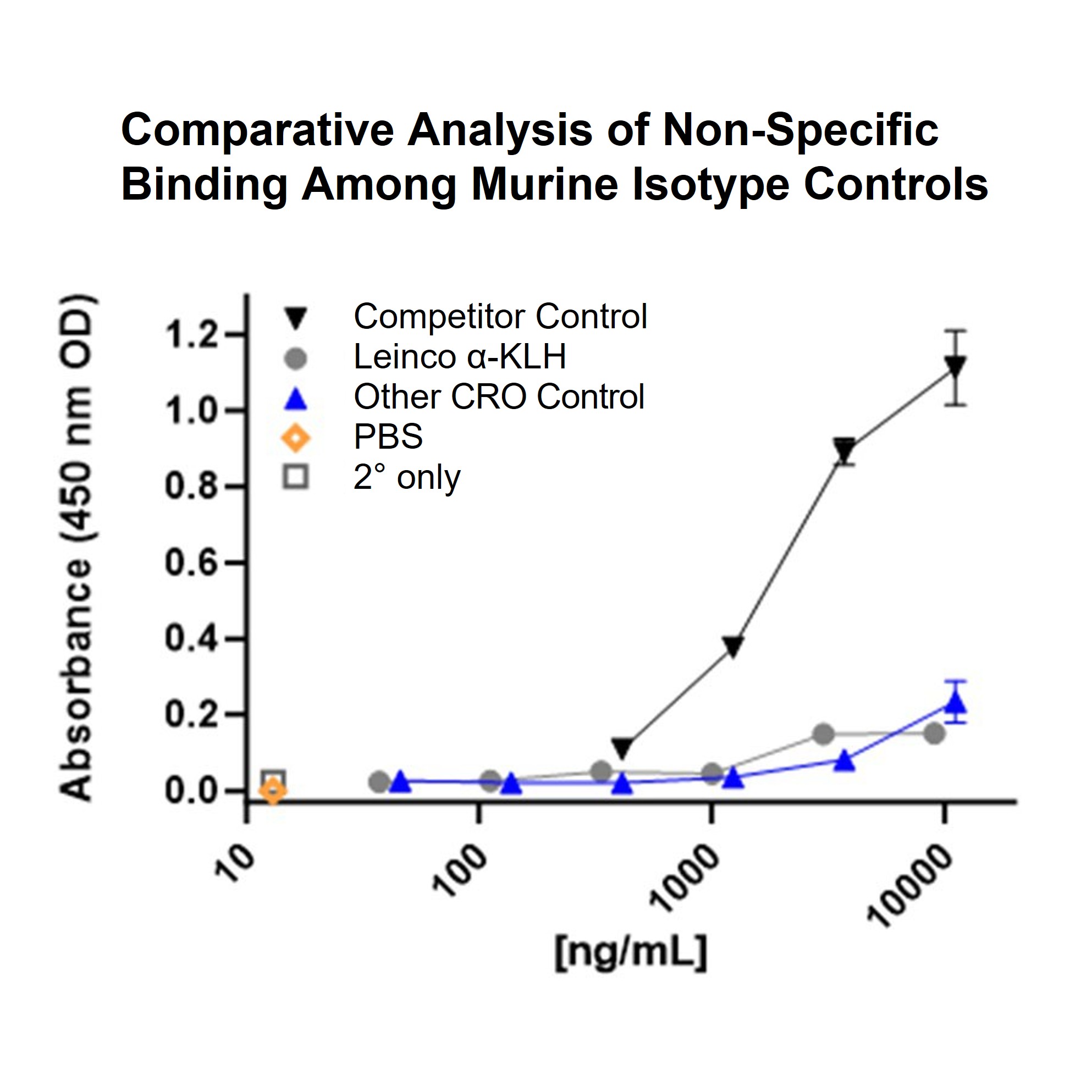 Figure 2. Comparative analysis of non-specific binding: Leinco Mouse IgG1 Isotype Control (Anti-KLH) vs. competitor. The chart shows that the Leinco Mouse IgG1 Isotype control (Anti-KLH, gray circles) demonstrates consistently low non-specific binding across all concentrations tested, with absorbance values near those of buffer and secondary-only controls. In comparison, the Competitor Control exhibits much higher non-specific binding at increased concentrations, indicating Leinco’s isotype control offers superior assay non-specificity.