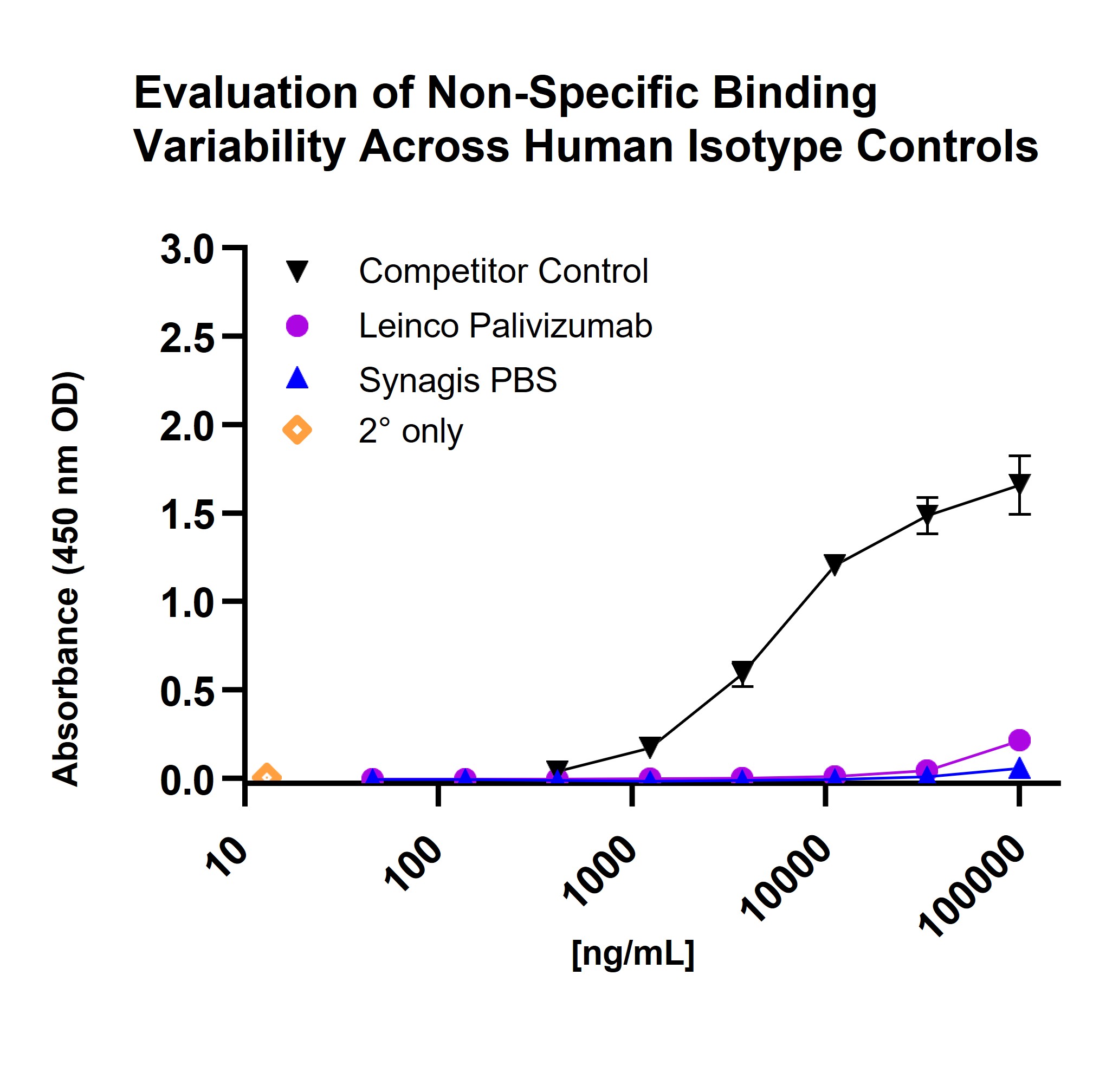 Figure 1. Non-specific binding profile of Leinco Biosimilar Palivizumab (Anti-RSV F Protein).The chart demonstrates that Leinco Biosimilar Palivizumab, anti-RSV F Protein (magenta circles), exhibits consistently low non-specific binding across all tested concentrations, with absorbance values nearly identical to those of PBS and secondary-only controls. In contrast, the Competitor Control displays a pronounced increase in non-specific binding at higher concentrations, indicating Leinco’s product offers superior assay non-specificity.