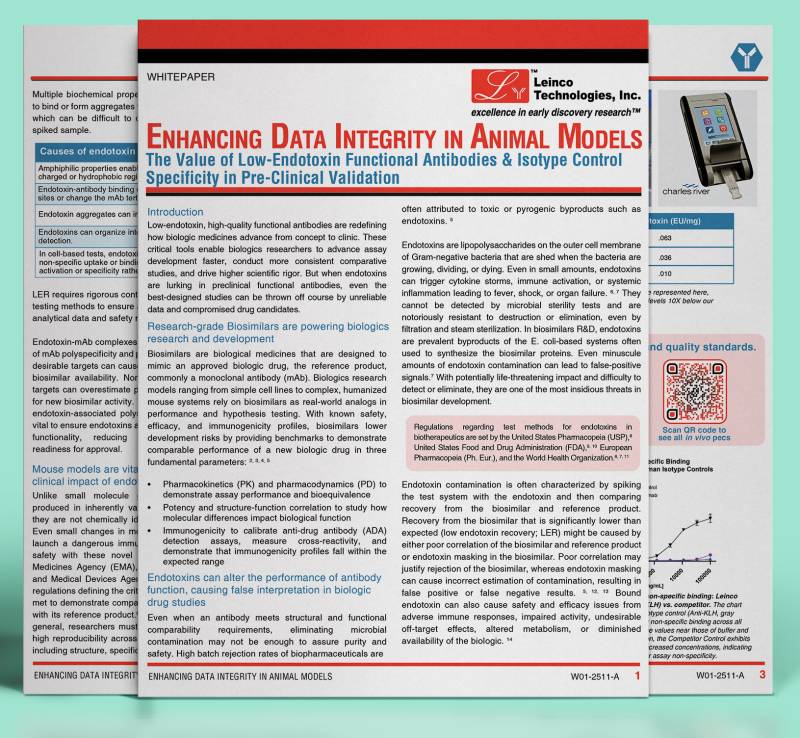 Leinco Technologies has spent over 30 years advancing quality control processes for optimization of research-ready biosimilars. Overlapping SDS-polyacrylamide gel electrophoresis and size-exclusion chromatography tests from multiple production lots confirm these biosimilars are strong analogs to their reference products in size, purity, and structure. Functional assays demonstrate highly reproducible performance similarity with the reliability of animal-free manufacturing systems. Leinco Technologies isotype controls, used to test biosimilar endotoxin levels, are designed and tested to the same stringent criteria.