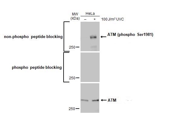 Untreated (–) and treated (+) 293T whole cell extracts (60 ug) were separated by 5% SDS-PAGE, and the membrane was blotted with ATM antibody [2C1] (3310) diluted at 1:1000. The HRP-conjugated anti-mouse IgG antibody was used to detect the primary antibody, and the signal was developed with Trident ECL plus-Enhanced. - -