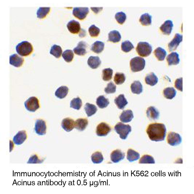 Antibody DetailsProduct DetailsReactive Species Human Host Species Rabbit Immunogen PN:A166 Product Concentration 0.5 mg/ml Formulation This polyclonal antibody is formulated in phosphate buffered saline (PBS) pH 7.4 containing 0.02% sodium azide as a preservative. Storage and Handling This polyclonal antibody is stable for at least one week when stored at 2-8°C. For long term storage, aliquot in working volumes without diluting and store at –20°C in a manual defrost freezer. Avoid Repeated Freeze Thaw Cycles. Country of Origin USA Shipping Next Day Ambient RRIDAB_2828046 Each investigator should determine their own optimal working dilution for specific applications. See directions on lot specific datasheets, as information may periodically change. DescriptionDescriptionSpecificity Rabbit Anti-Human Acinus (CT-2) recognizes an epitope near the C-terminus of Human Acinus (CT-2). This polyclonal antibody was purified using immobilized peptide affinity chromatography. Background Chromatin condensation and nuclear fragmentation (CCNF) is the hallmark of apoptosis. CCNF is triggered by the activation of members of caspase family, caspase activated DNase (CAD/DFF40), and several novel proteins including AIF and CIDE. A new inducer of chromatin condensation was recently identified and designated Acinus (for apoptotic chromatin condensation inducer in the nucleus). Acinus is cleaved by caspase-3 and an additional unknown protease generating a small active peptide p17, which causes chromatin condensation in vitro when it is added to purified nuclei. Acinus also induces apoptotic chromatin condensation in cells. Acinus is ubiquitously expressed. Three different spliced forms of Acinus have been identified in human and mouse and designated AcinusL, AcinusS and AcinusS’.2 PubMed References & Citations1. Zamzami, N. and Kroemer, G. (1999) Nature 401:127-8. 2. Sahara, S. et al. (1999) Nature 401:168-73. Technical ProtocolsCertificate of Analysis |