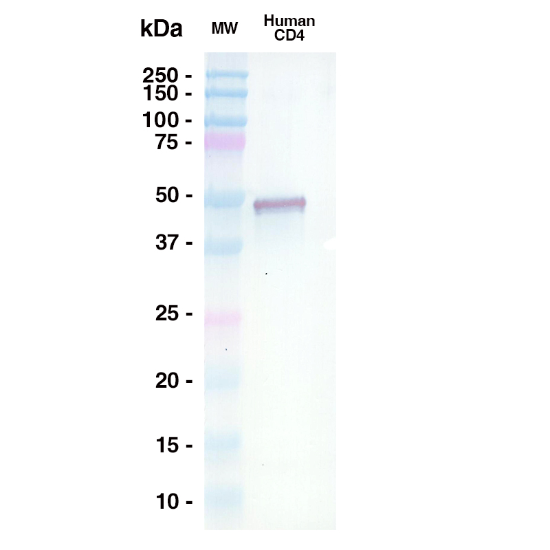 A 0.5ug sample of Human CD4 was loaded onto an SDS-PAGE gel under reducing conditions and probed with TNX-355 (Leinco Prod. No.: LT3200) @ 15ug/mL, Goat Anti-Human IgG secondary antibody 1:1000 dilution (Goat Anti-Human IgG (H+L) adsorbed against ms HRP (Leinco Prod. No.: H215)