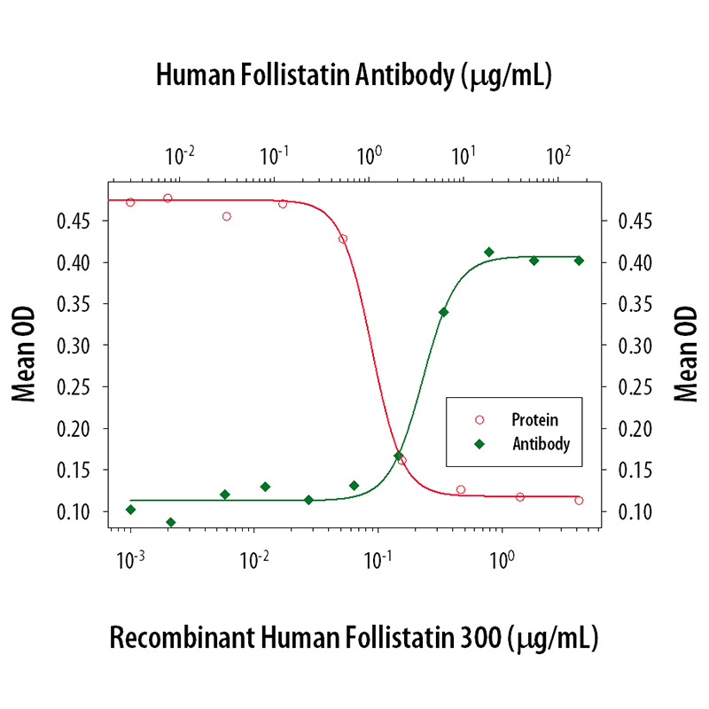 Antibody DetailsProduct DetailsReactive Species Human Host Species Goat Immunogen Purified Recombinant Human Follistatin, aa 30 - 329 (>98%) Endotoxin Level <0.1 EU/µg as determined by the LAL method Formulation This antigen affinity purified polyclonal antibody has been 0.2 µm filtered and lyophilized from modified Dulbecco’s phosphate buffered saline (1X PBS) pH 7.2 – 7.4 containing 5.0% w/v trehalose with no calcium, magnesium, or preservatives present. State of Matter Lyophilized Storage and Handling The lyophilized antigen affinity purified polyclonal antibody can be stored desiccated at -20°C to -70°C for twelve months from date of receipt. The reconstituted antibody can be stored for at least four weeks at 2-8°C. For long-term storage of the reconstituted antibody, aseptically aliquot into working volumes and store at -20°C to -70°C in a manual defrost freezer. Avoid Repeated Freeze Thaw Cycles. No detectable loss of activity was observed after six months. Country of Origin USA Shipping Next Day Ambient RRIDAB_2830154 Applications and Recommended Usage? Quality Tested by Leinco Western Blotting: To detect Human Follistatin, aa 30 - 329 this polyclonal antibody can be used at a concentration of 0.1-0.2 µg/ml. This polyclonal antibody should be used in conjunction with compatible second-step reagents such as PN:G505 and a chromogenic substrate such as PN:T343. The detection limit for Human Follistatin, aa 30 - 329 is 5AND50 ng/lane under either reducing or non-reducing conditions. The sensitivity of detection may increase up to 50 fold when a chemiluminescent substrate is used. A suitable Western blotting control is PN:F168. Additional Applications Reported In Literature ? IHC (NBF/Par.): This antibody should give satisfactory staining results when used at a concentration of 15 µg/ml. The recommended secondary antibody for IHC is PN:G505. For chromogenic detection with high signal and low background use PN:D100 or PN:K107. Neutralization: Measured by its ability to neutralize Follistatin inhibition of Activin A-dependent hemoglobin expression in the K562 human chronic myelogenous leukemia cell line. At 6 μg/mL, this antibody will neutralize >60% of rhFollistatin 300 bioactivity on K562 cells. Each investigator should determine their own optimal working dilution for specific applications. See directions on lot specific datasheets, as information may periodically change. DescriptionSpecificity Goat Anti-Human Follistatin, aa 30 - 329 recognizes Human Follistatin, aa 30 - 329. This antigen affinity purified polyclonal antibody was purified using a proprietary chromatographic technique that includes covalently immobilizing the antigen proteins or peptides to agarose based beads. This purification method enhances specificity, reduces nonspecific binding of extraneous IgG and provides you with the most reliable reagent available for your early discovery research. PubMed NCBI Gene Bank ID UniProt.org References & CitationsTechnical ProtocolsCertificate of Analysis |