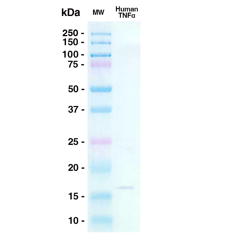 A 0.3ug sample of Human TNFa was loaded onto an SDS-PAGE gel under reducing conditions and probed with D2E7 (Leinco Prod. No.: LT100) @ 10ug/mL, Goat Anti-Human IgG secondary antibody 1:1000 dilution (Goat Anti-Human IgG (H+L) adsorbed against ms HRP Leinco Prod. No.: H215)