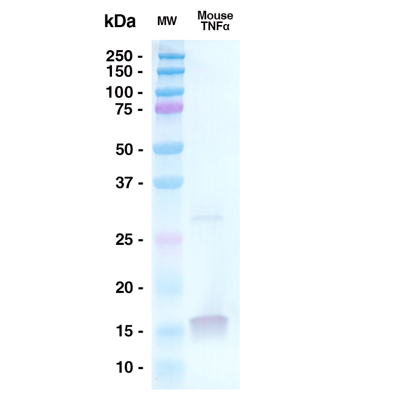 A 1.0ug sample of mouse TNFa was loaded onto an SDS-PAGE gel under reducing conditions and probed with TN3-19.12 (Leinco Prod. No.: T259) 15ug/mL, Goat Anti-Armenian Hamster IgG HRP secondary antibody 1:5000 dilution (Goat Anti-Armenian Hamster IgG HRP (H+L) from Jackson Labs #127-035-160)